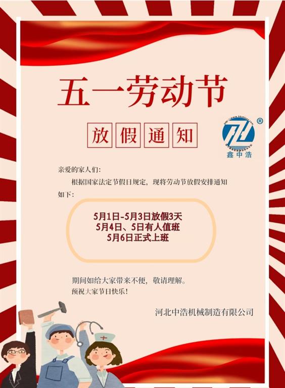 五一勞動節,根據國家法定節假日要求,河北中浩機械制造有限公司對節假日做出以下安排: